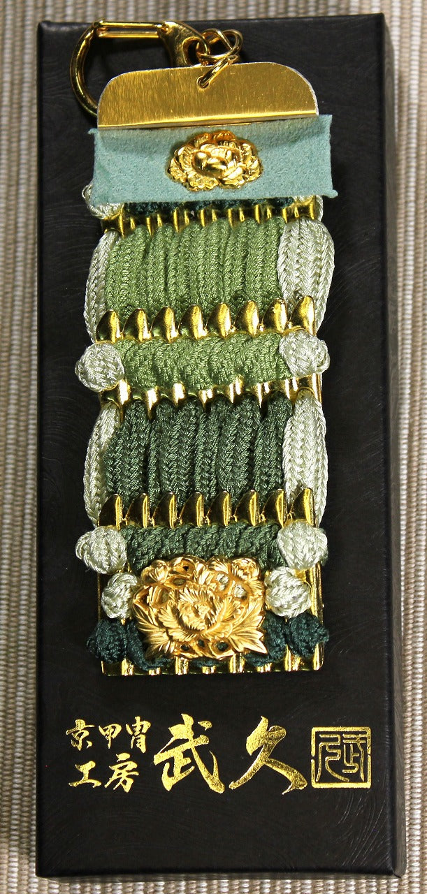 大鎧の「栴檀板(せんだんいた)」をモチーフにした身近に持てるIDOMU!キーホルダーを伝統工芸が真心こめて制作しました!甲冑の中でも、胸部を守る大事な装備であるパーツです。この栴檀の板は、京甲冑ならではの、本金箔・本金鍍金金具・正絹糸・本金鍍金を使用しています。