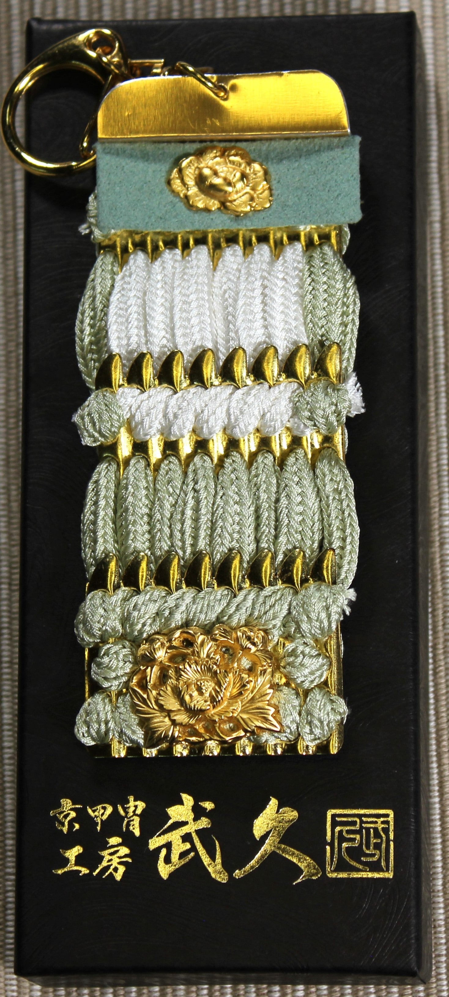 大鎧の「栴檀板(せんだんいた)」をモチーフにした身近に持てるIDOMU!キーホルダーを伝統工芸が真心こめて制作しました!甲冑の中でも、胸部を守る大事な装備であるパーツです。この栴檀の板は、京甲冑ならではの、本金箔・本金鍍金金具・正絹糸・本金鍍金を使用しています。