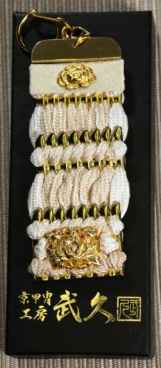 大鎧の「栴檀板(せんだんいた)」をモチーフにした身近に持てるIDOMU!キーホルダーを伝統工芸が真心こめて制作しました!甲冑の中でも、胸部を守る大事な装備であるパーツです。この栴檀の板は、京甲冑ならではの、本金箔・本金鍍金金具・正絹糸・本金鍍金を使用しています。
