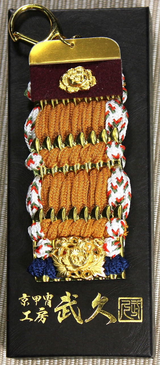 大鎧の「栴檀板(せんだんいた)」をモチーフにした身近に持てるIDOMU!キーホルダーを伝統工芸が真心こめて制作しました!甲冑の中でも、胸部を守る大事な装備であるパーツです。この栴檀の板は、京甲冑ならではの、本金箔・本金鍍金金具・正絹糸・本金鍍金を使用しています。