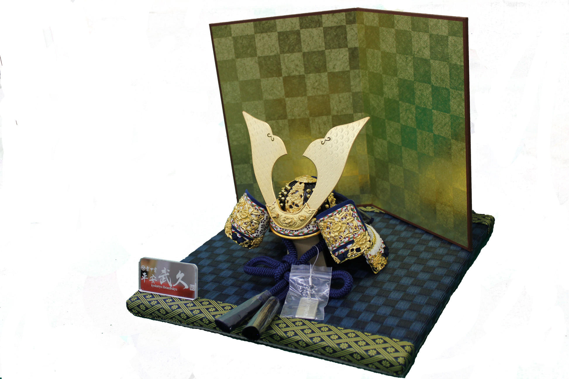 縅糸と、飾り台・屏風と、トータルコーディネートした兜飾りで、工房武久ならではの兜飾り。