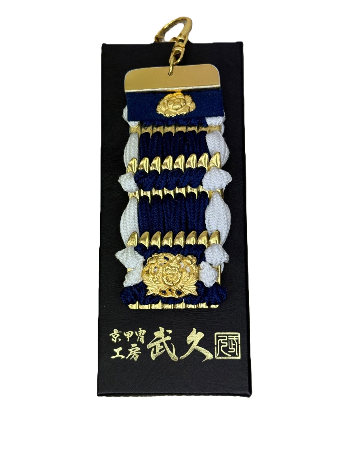 大鎧の「栴檀板(せんだんいた)」をモチーフにした身近に持てるIDOMU!キーホルダーを伝統工芸が真心こめて制作しました!甲冑の中でも、胸部を守る大事な装備であるパーツです。この栴檀の板は、京甲冑ならではの、本金箔・本金鍍金金具・正絹糸・本金鍍金を使用しています。
